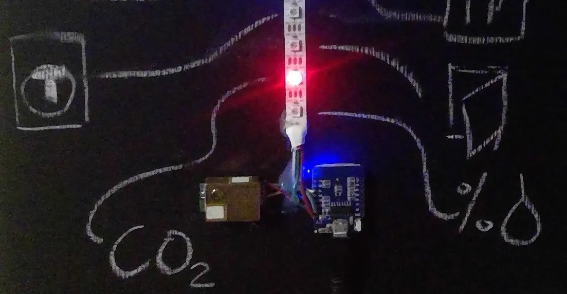 Wemos D1 mini, Neopixel, CO2 sensor on a blackboard, pixelmeanings are described by the chalk drawn icons.